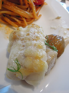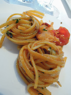 Linguine with sicilian red shrimp & imperial cavier & cherry tomato sauce: 是比以前在Ambrosia吃到的還要進步,沒記錯的是用龍蝦殼煮的湯底,蝦的上面鋪了魚子醬獨特的pattern,吃起來有al dente的質感,令人不失望。