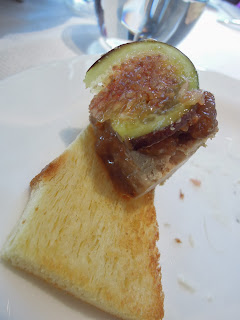 Terrine of duck foie gras stuffed with fig chutney: 這個鴨肝看起來就像是一磚小磚頭,把鴨肝抹在一小片多士上, 還要鋪上一小片無花果,印象中鴨肝磚中間是有一點果醬的,吃起來有點酸酸的,也精彩。