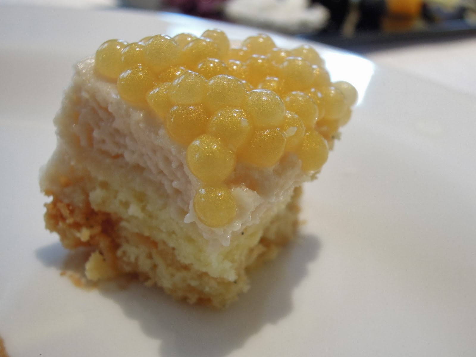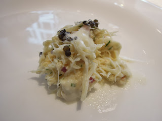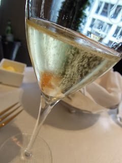 Champagne cavier with white peach mousse cake ($188): 這個就是香檳魚子醬,墊底的是白桃蛋糕,光是看擺盤就是一個花花世界。白桃蛋糕入口是陣陣的清香,驚喜的跟魚子醬互相配合。這一頓以魚子醬作結,正好回應了第一道的魚子醬前菜,是一個完滿的首尾呼應。