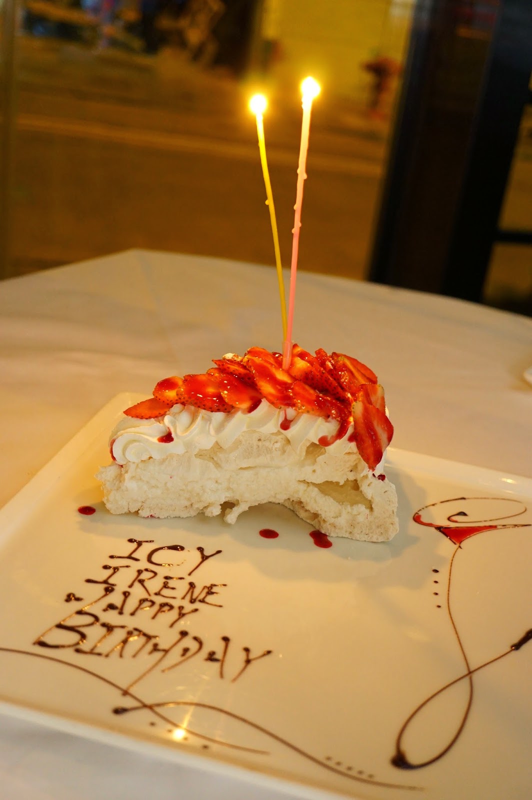 甜點: 要挑剔的是在訂座前已經有說好要在甜點上寫生日的祝福字句,但送來的還是沒有的,有點失望,後來是要暗暗提示才有換回來,但賣相是甜美的討好,味道上也不失望,就是像蛋白餅和草莓混合在一起的,兩者合起來甜度是剛好的。