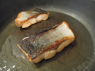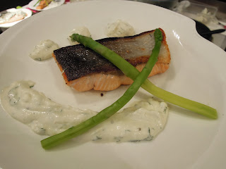 學煎三文魚也是有趣的,要先在三文魚皮那一面先切幾刀,在煎的時候,先煎有皮的一面,煎了一會,已經是滿室三文魚濃郁的香氣,很吸引,再而放適量的鹽跟黑胡椒調味。最後上碟後再加剛才調較的酸忌廉汁。
