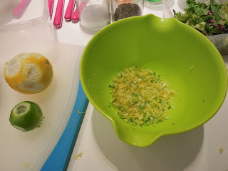 率先做的是三文魚檸檬他他醬,先是放檸檬皮跟青檸皮,再加入檸檬汁。再加入各種調味料,做法也是挺簡易的。