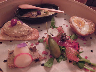 最厲害應該是那個還是半流心的Scotch egg了吧,簡單來說就是一顆炸蛋,麵包糠脆皮夠薄身,蛋跟脆皮中間還有一層肉,真不簡單,聽食友更說這個是他吃過最好吃的,而餐廳GM更說如果有吃過更好吃的話要跟他說呢!那個用小碗放着的蟹肉是很creamy的,可以拉出一絲絲的蟹肉,嘴內的那分質感跟鮮味,也令人回味。切得薄片的Beetroot salmon也精彩; duck & chicken parfait質感很creamy; ham rock terrine可以塗在麵包上,但單吃已精彩。