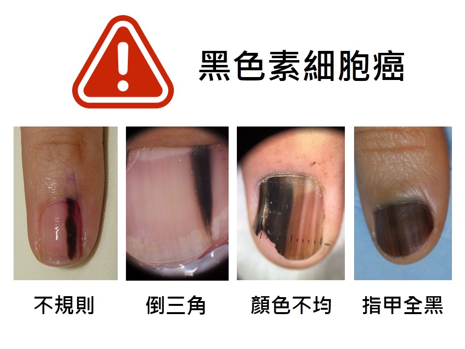 假如指甲出現黑線、黑斑時絕對不可大意,假如黑線從角質層延伸到指甲尖端,可能是「黑色素瘤」所引起的,建議立即至醫院做檢查。