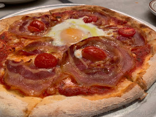 我們坐近廚房,清楚見到廚師製作Pizza,Pancetta 古法意式煙肉pizza,材料包括番茄醬、水牛芝士、意大利煙肉、車喱茄及半生熟雞蛋,廚師放好番茄醬及意大利煙肉後放入爐烘數分鐘後,再打隻雞蛋在薄餅中央,回爐焗至半熟狀態就準備好。我們吃時塗勻蛋黃,每件pizza 也有蛋香,不錯喔。