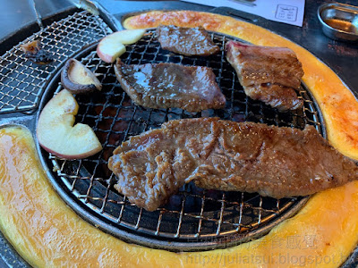 點餐後,店員立刻落蛋及泡菜蛋於鍋邊,吃著前菜不久,兩碟拼盤已送到,先燒牛胸腹、豬五花等,蘸點鹽已很滋味,再來加點泡菜做個生菜包更清爽,最後燒牛肋骨,剪開數件配白飯非常夾。餐廳地方寬倘乾淨,座位舒服,是開心的體驗啊。