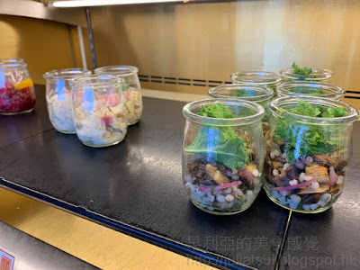 前菜沙律做得好有心思,樽仔沙律如紅菜頭藜麥、羽衣甘藍洋薏米、薯仔沙律等,水牛芝士雜色車喱茄、雅枝竹沙律、自家醃三文魚柳等等。魚生除三文魚、八爪魚外,還有鰹魚及赤貝。