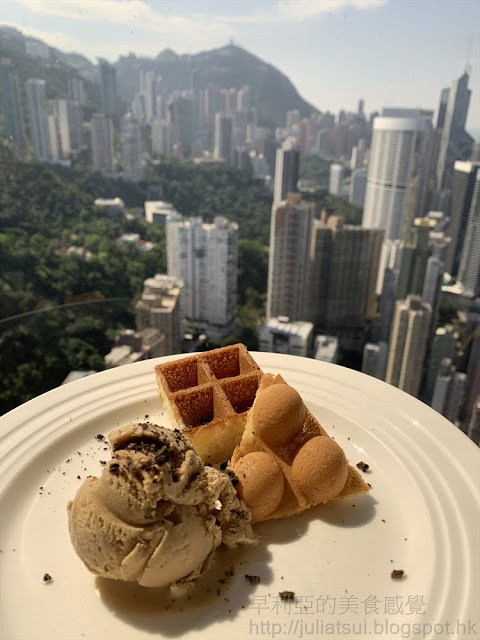 以往轉一圈須66分鐘,餐廳因而得名,而現在旋轉一圈須約2小時,所以居高臨下欣賞風景之餘,發覺剛剛已望到同樣位置,表示自助餐時間亦差不多了,是時候到甜品區享用多款特色蛋糕及布甸,雪糕是自家製,早利亞喜歡配 waffle 食,仲有雞疍仔,質素比一般坊間質素高,有內涵又有煙靭口感,蛋糕布甸款式豐富,味道也有層次,相當回味。