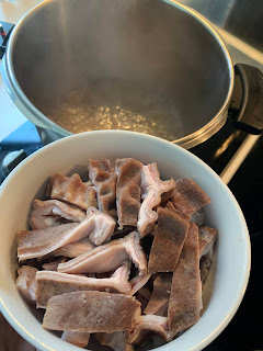 豬肚先出水,去多餘油份及雜質,切件備用。