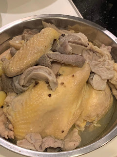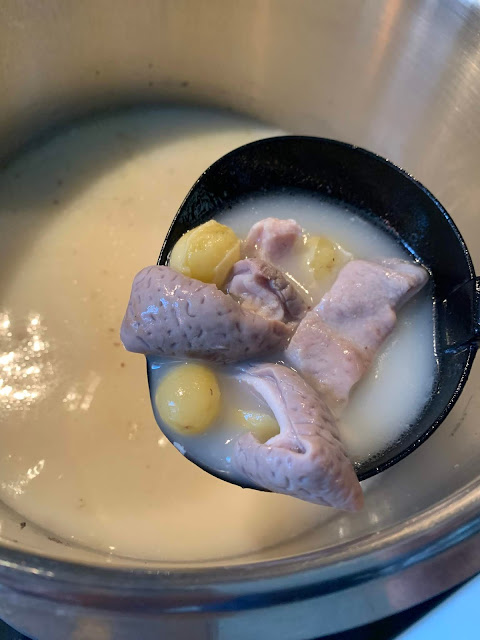 白胡椒稍為盅碎,加2片薑爆香加水,落銀杏腐竹及豬肚大火煲滾,收中火煲45分鐘左右,加雞再煲至腍身,加鹽調味即可~