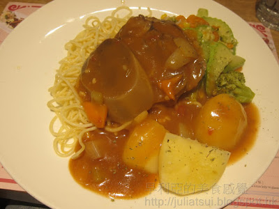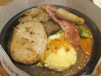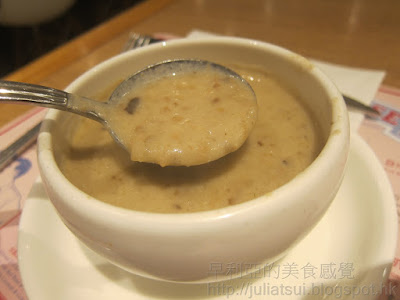 先來湯及餐包,餐包烘得夠透,而且底部微脆,說明不是微波爐焗的,應記一功。可是蘑菇湯及素鮑魚生菜絲忌廉湯就非常鹹,本來忌廉味濃及蘑菇也香,難道廚師叔叔忘記了再下多一次鹽,真是沒辦法飲下去。對以下主菜也沒有太大期望之際,鐵板扒及牛脷也來了。鐵板雜扒包括牛柳、雞扒、豬柳、香腸及煙肉,看得出不是敷衍材料,而牛脷亦夠腍,醬汁有紅酒香。姍姍來遲的葡國焗鮮軟雞,雞果然滑,葡汁椰香撲鼻,跟早前的餐湯形成太大的對比了。挽回了信心,我仍會再來試試其他懷舊餐的。