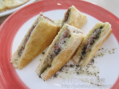 黑松露塗上麵包,加水牛芝士烘熱後,加入巴馬火腿,塗上牛油後烘香麵包便成黑松露巴馬火腿三文治,記得立刻食,鹹香脆口。