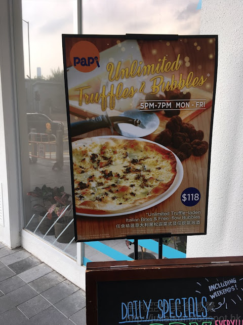 到銅鑼灣Shopping,經過位於銅鑼灣加寧街,裝修有歐洲小白屋感覺的PAPI,知道店子的手工意粉很出色,望望餐單之際發現店子推出 Happy hour 優惠,$118 任飲氣泡酒加任食精選意大利黑松露菜式 Happy Hour Unlimited Truffles & Bubbles,包括黑松露薄餅、黑松露巴馬火腿三文治同黑松露薯條,蠻吸引。
