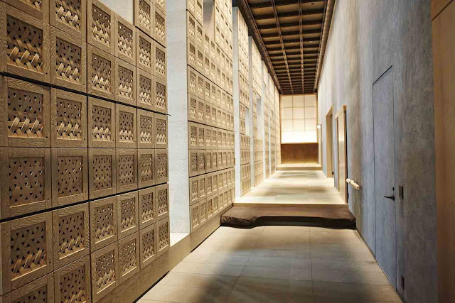 在日本文化裡,大門被視為迎賓之用,因此他們十分注重其設計,而星野東京日式旅館的大門就用上實木設計,讓旅客可以感受到大自然的氣息,而接待處就用了珍珠赭石平整的設計中帶有日本風格,天花板則融入了摺紙工藝的概念,平整有序令人舒適。