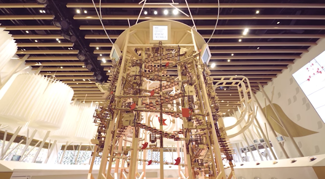 這個設計出色的裝置,是由日本創意團隊Bascule花了5個月的時間研究及製作,用了1450片木條為材料所組合而成,而配合紅球經過而發出起聲音的木條就有180片。