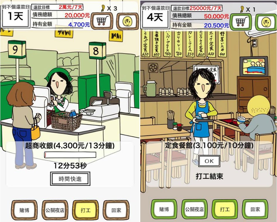 在「賭博」的選項中,遊戲分別有「賽馬」、「拉霸機」及「彩卷」,玩家會隨遊戲的進度來解鎖更多玩意,例如注額越來越大的馬場及拉霸機款,當然下注的金額越大,可贏得的錢也會越多,不過玩家要留意左上方的顯示,因為7天後討債鳥人就會來討債,屆時玩家沒有足夠金錢還的話,就要用物品、太太或問人借,來解決欠款。