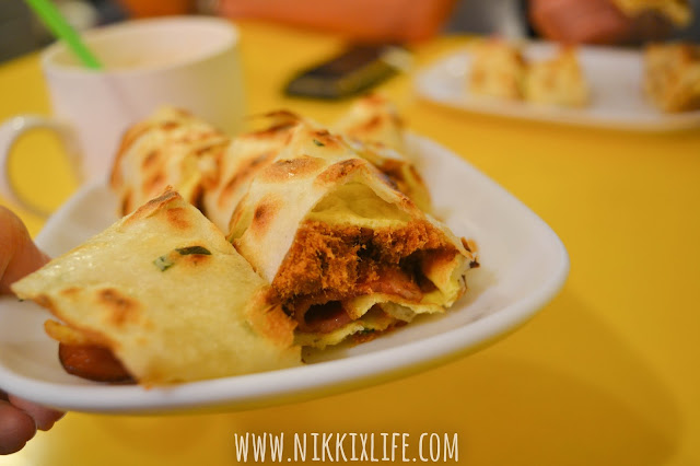 花了一小時我的特焙蛋餅終於來到了,我的是特培蛋餅,即是蛋餅夾雜著培根和超多肉鬆,天氣這麼熱也要來杯珍珠奶茶!
