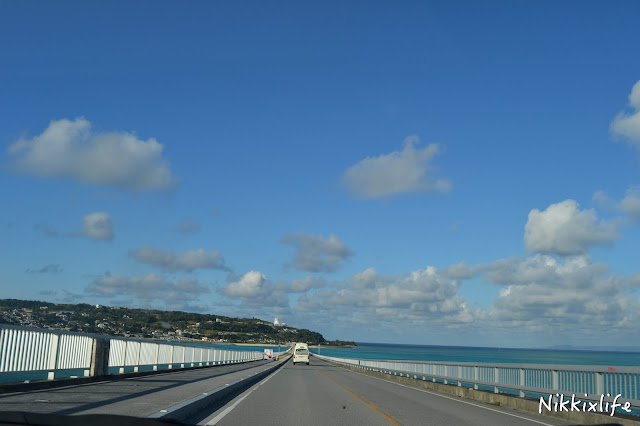 去完沖繩水族館後,比原定的時間早了,決定到本想取消的古宇利島看日落。古宇利島又稱「神之島」,配上好天氣,這湛藍的景色讓你陶醉在一片風景之中。把車子駕往古宇利大橋,全長1960公尺,一條筆直大橋面前的景色堪稱沖繩第一風景,實在當之無愧!