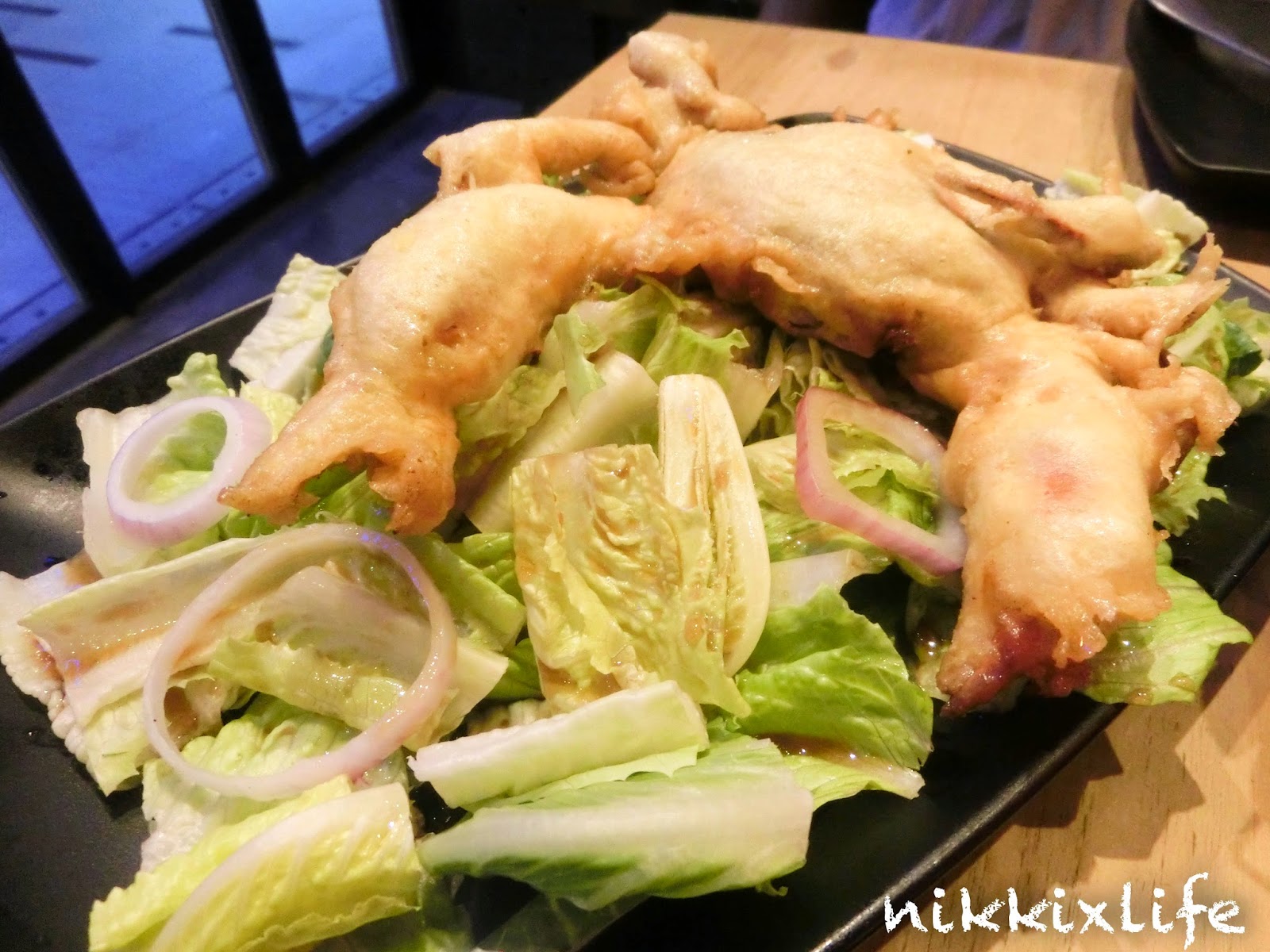 這樣看起來,一點都不像是沙律,因為軟殻蟹很少列入為沙律的材料內。但這樣軟殻蟹沙律確甚有霸氣。在軟殻蟹的下面鋪滿生菜和洋蔥作沙律,生菜上淋上沙律醋,可是材料方面略嫌單調了一點,建議可以多加蕃茄、青瓜、粟米。不但豐富了視覺上的效果,更讓味覺有多一點的刺激。