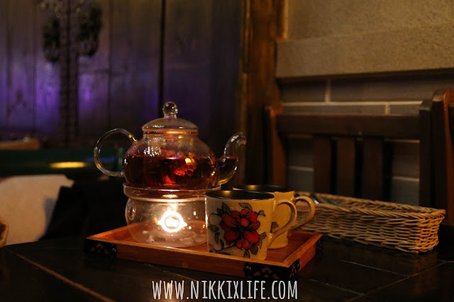 玫瑰花茶清淡、幽香,在這柔和的燈光下給氣氛再加點分數。