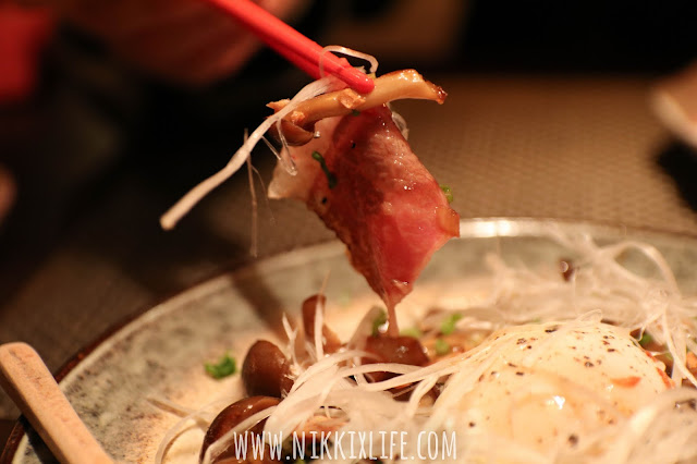 牛肉和菇類很多時都會被安排配搭在一起,而實際上他們一起出現都是令人感到安心的配搭。這道菜的和牛薄切分散在碟上,混合了菇類,令味道不會單調,也增加了口感。醬汁調得夠惹味,在加上中間的溫泉蛋,戳破後的蛋汁緩緩流出,和牛沾上蛋汁更加的嫩滑和美味。