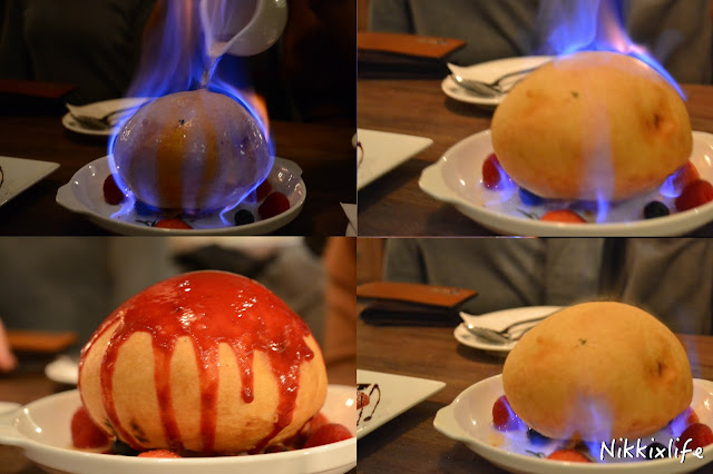 球形的餡餅把雲尼拿雪糕包圍著,淋上白蘭地,然後點火,店員快而準的動作差點讓我們應接不暇,緩緩的熊火在我們面前燃燒著,湊著那火光要把握時間,捕捉最美的一刻。然後淋上紅桑梅醬上碟。