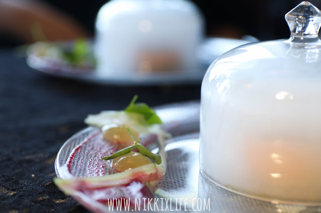 配菜有紅菜頭蓉和用分子料理製作的蘋果啫喱,相當有特色。大廚把紅菜頭蓉當作毛筆似的在碟上即席揮毫,看得出製作出那撮的紅菜頭蓉的力度和剛柔並重的技巧。