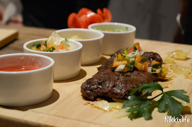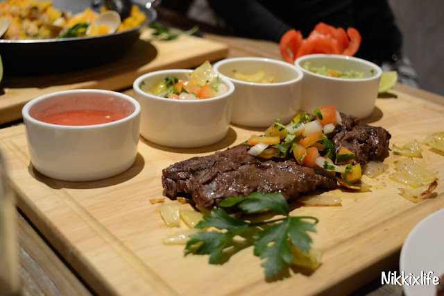 Skirt Steak取自牛腹部中間、側膜橫肌的部位,在脂肪與脂肪之間的一層肌肉,因此不帶任何脂肪。所以吃到的都是不折不扣的牛肉,也因為全沒脂肪,吃到的味道比平時的更富有香濃肉香,牛肉味濃郁,很有嚼感,相當滋味。墨西哥菜常常都有很多醬汁,這道Skirt Steak菜式也有洋蔥、酸甜醬、Salsa醬等等的醬汁,尤其是牛油果醬最得我歡心,塗在Skirt Steak上無形減弱了Steak到口中的那份油膩感,單吃牛油果醬非常清新,但對我來道,還是不沾任何醬汁的也能吃到肉質的美味,體現那份拉丁美洲烤肉的滋味。