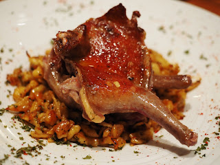 Slow-cooked pigeon with spaetzle pasta with black pepper