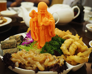 豪華大拼盤,單是中間的壽星公挑花已可見大廚刀功,四款小品中,特別喜愛椒鹽九肚魚,香脆可口,而較特別的髮菜卷也值得一試