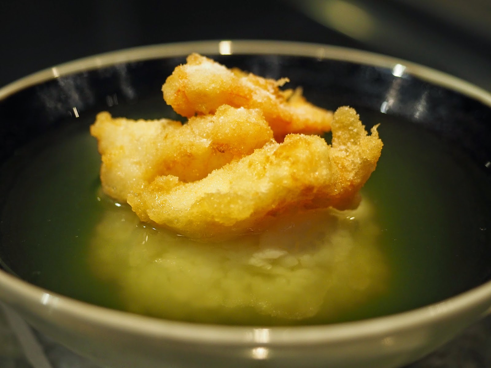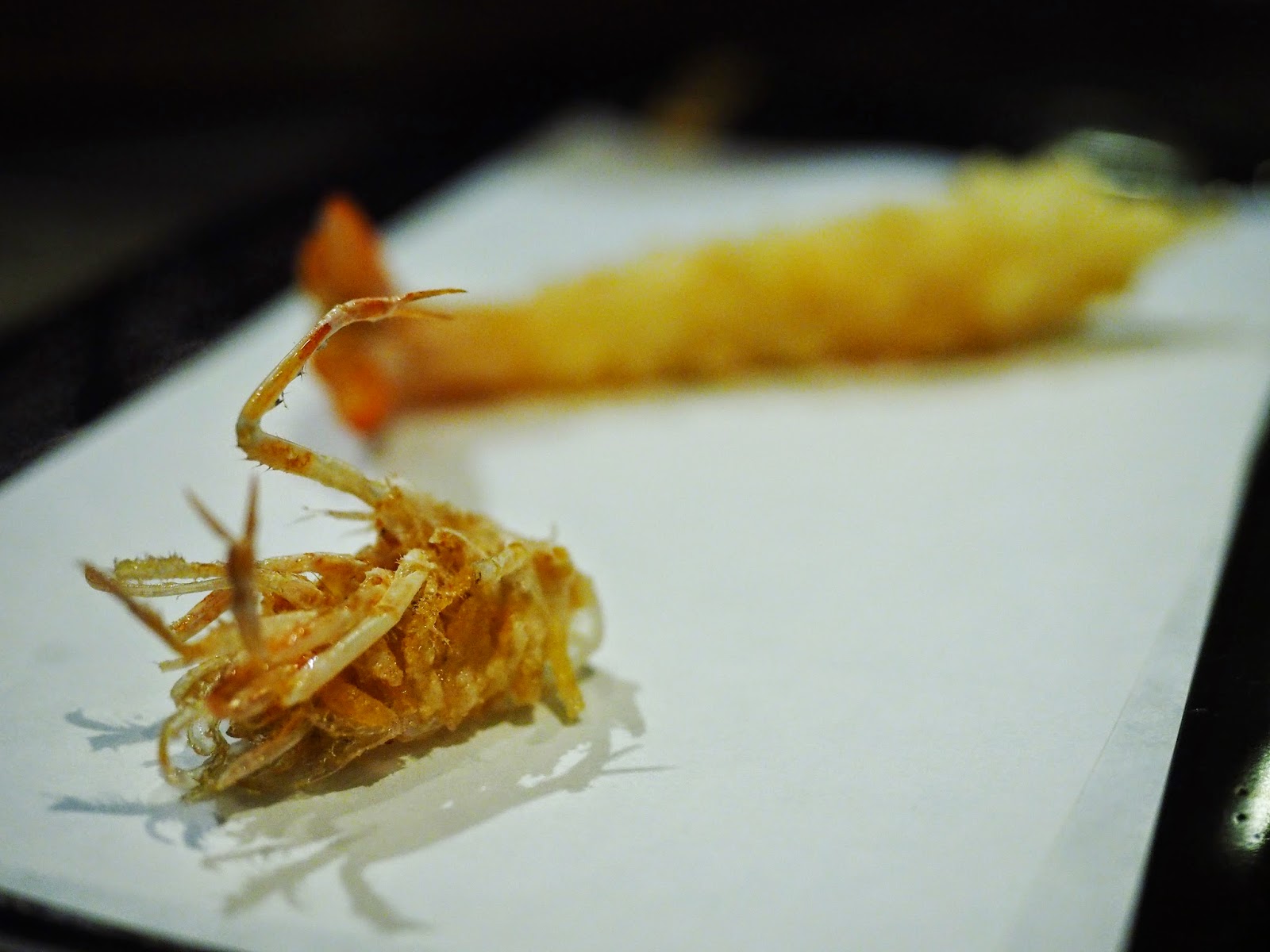 吃罷前菜,侍者就替我倆設好蘿蔔蓉等配料,準備品嚐大廚為我們製作的一系列天婦羅,蘿蔔蓉一早已調配好檸檬汁,另有咖喱鹽和日本白鹽作選配,大廚提醒,這裡的天婦羅主要是吃食材的鮮而不是吃醬油那款(即是比較厚粉的那一款天婦羅),所以大都只需略加一點調味就可以