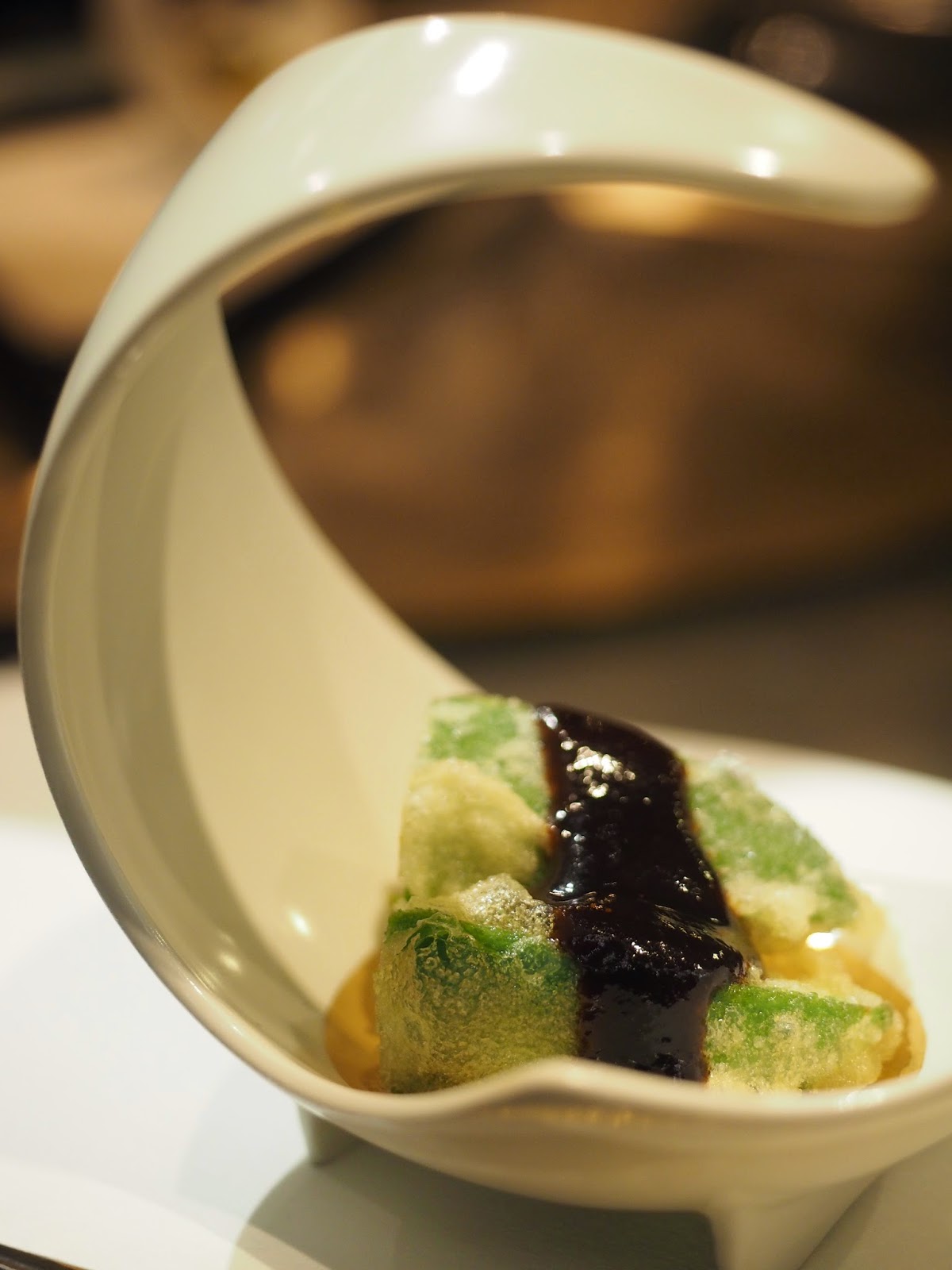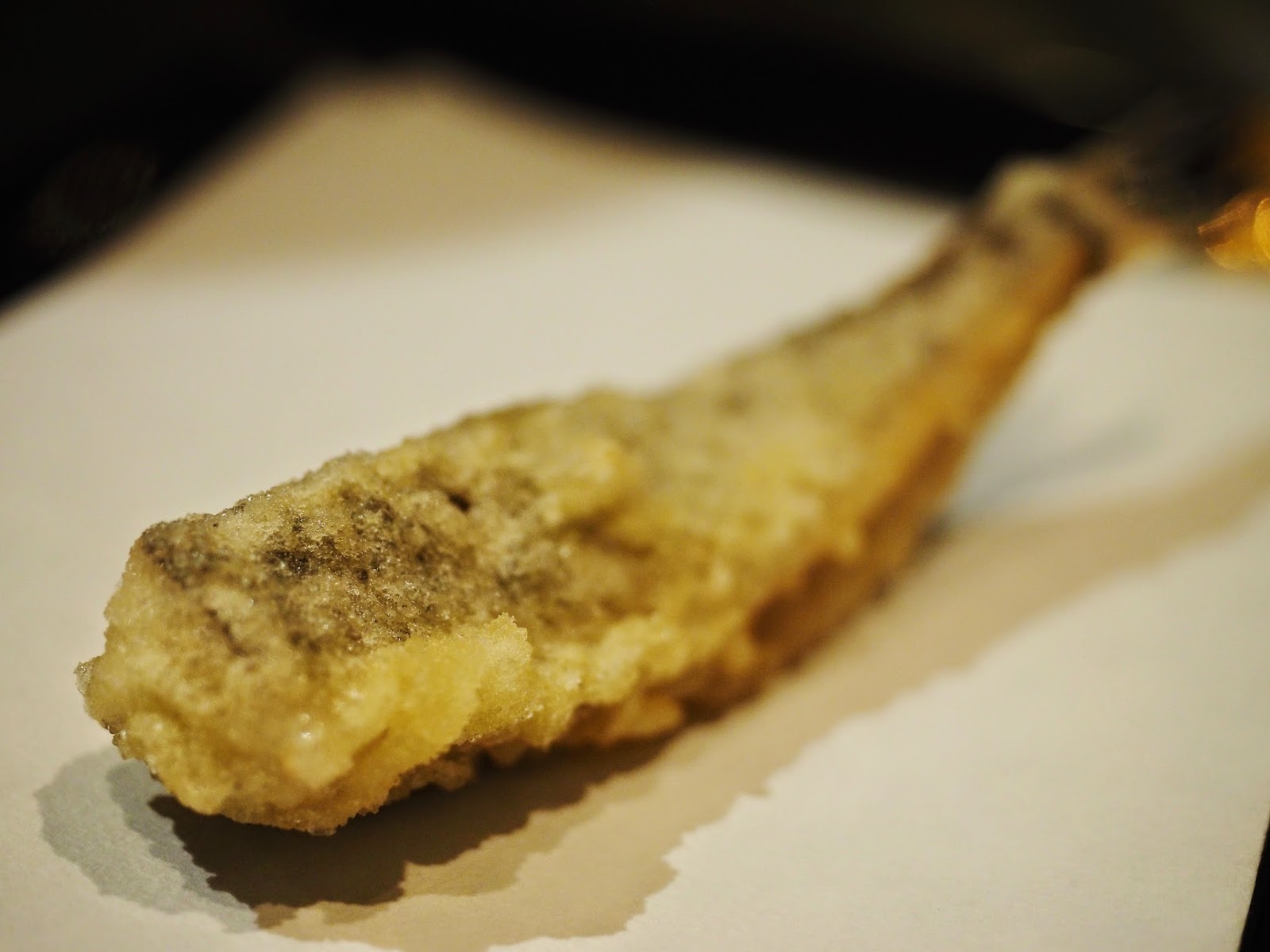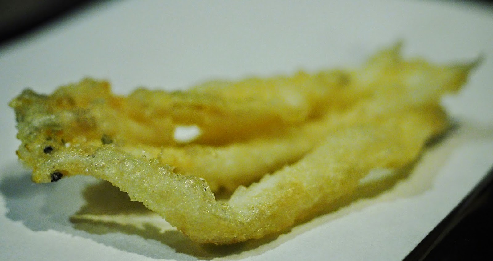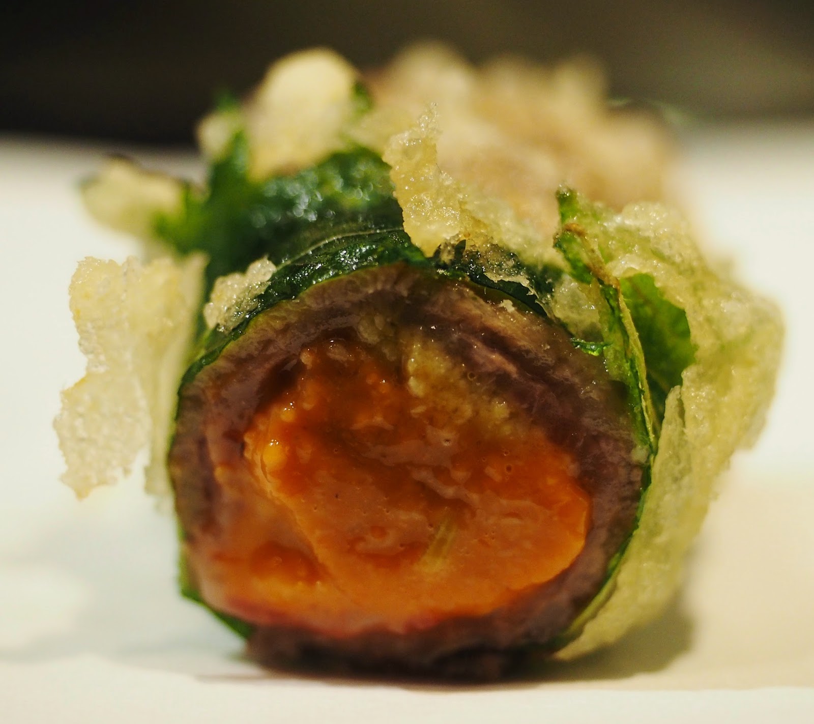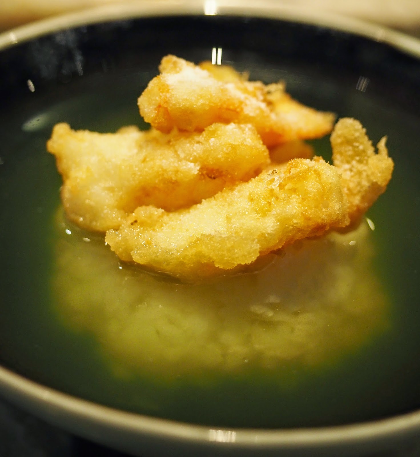 梅天婦羅,原粒梅肉先蒸過煮過才落油炸,入口要小心,半蓉的梅仍是熱騰騰的,原不太好吃梅的,因為總覺得很酸很鹹,不過因事前已作處理才炸,味道就來得剛好