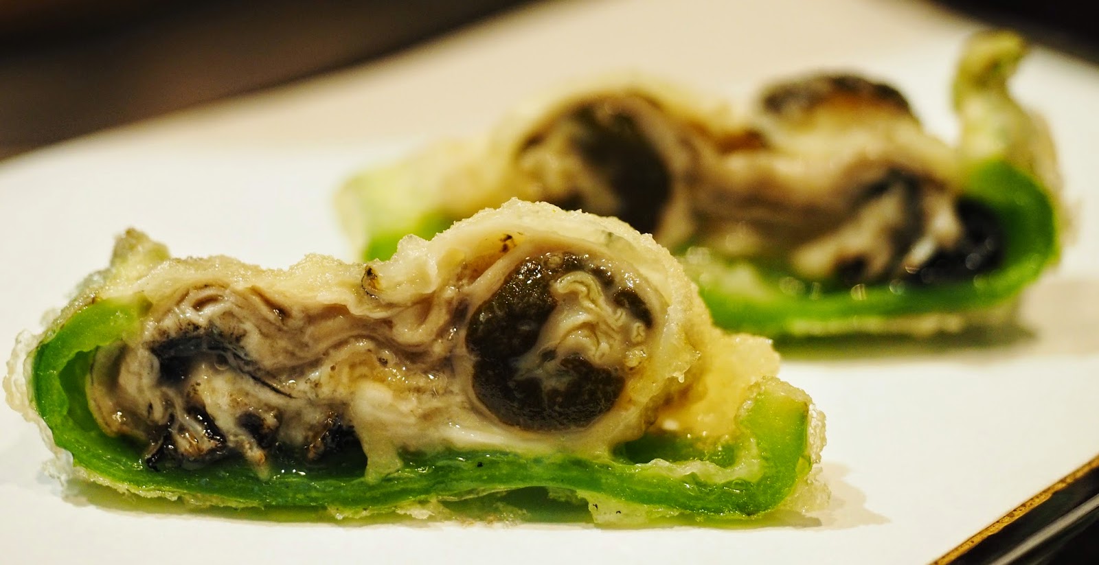 另一款是晚最愛,是這款由大廚獨創的牡蠣天婦羅精巧之處在於生蠔會配以日本燈籠椒一起製作,送來時再垂直切開一半,賣相特別,大廚運用燈籠椒不太濃的特點,用來伴鮮香的蠔肉,喜出望外的匹配,讚呀!!!