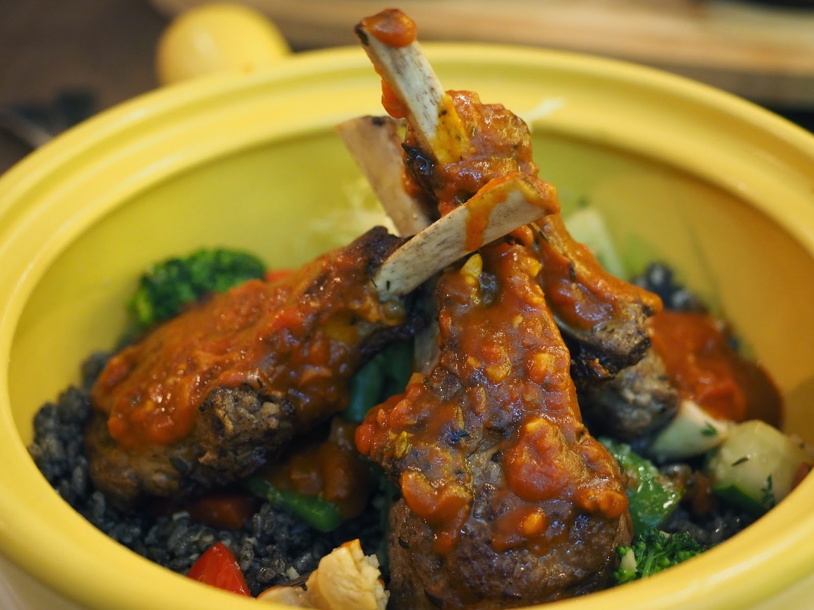 先來數款「暖意鍋心」系列,比利更對這款香蒜燒汁烤紐西蘭特級羊架墨魚汁飯印象深刻
