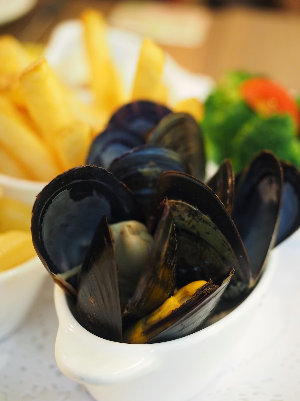 其他配料齊上,包括加拿大藍青口 l 車打芝士腸 l 意式香草肉丸 l 西蘭花 l 香草白菌 l 蜆殼粉,當然少不了薯條及法包粒喇