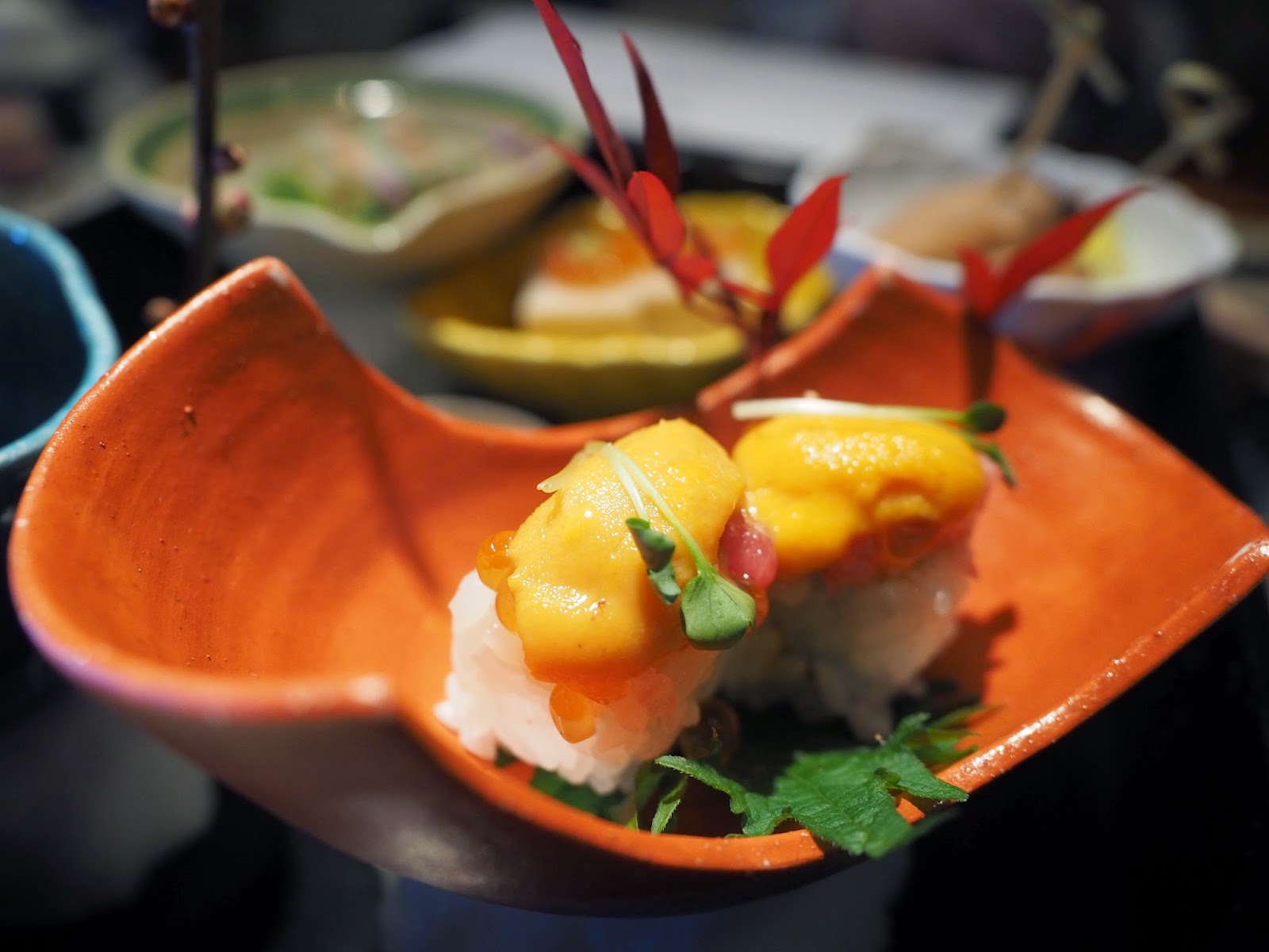 先試日式鹹點,當日的秋季壽司卷物是海膽配吞拿魚蓉,香甜的海膽滑口非常,一點也沒腥,而中間的吞拿魚蓉也是鮮味滿載,少少一件,也做得很有水準!