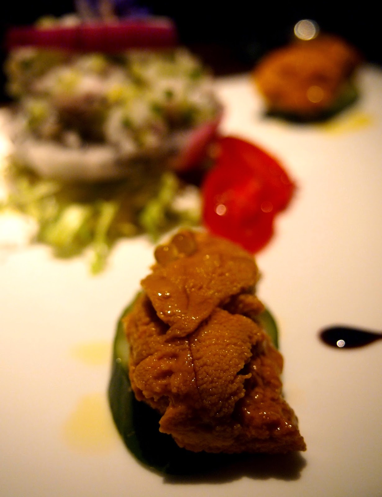 這搶眼的前菜,青瓜片上放上幾件加拿大海膽,鮮味豐潤,配上爽口的青瓜,營造出不同的口感