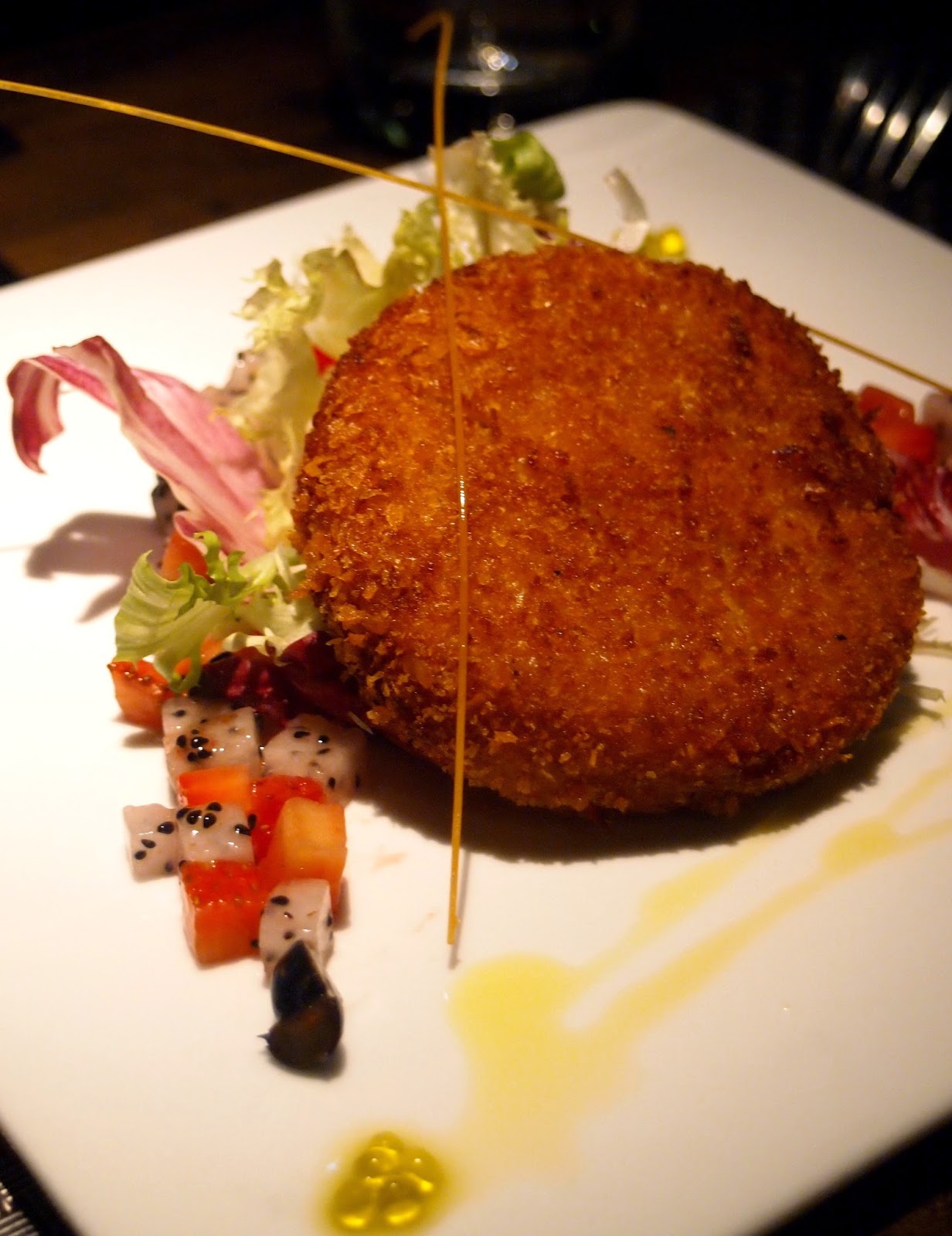 Deep Fried Crab Cake and Fresh Fruit Salad懶惰的小丸子就是愛吃蟹餅,這客金黃色的蟹餅做得外層香脆,入面則是絲絲鮮嫩的蟹肉