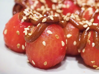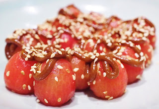 兩道前菜,先來 麻醬拌蕃茄,要將番茄搣皮實在不易,真的要細心加上耐性俱備方可,清新番茄肉配以香濃芝醬,味道層次十足