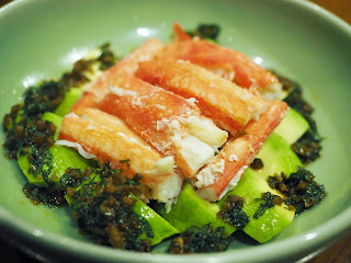 紫蘇蒜醋牛油果伴阿拉斯加蟹腳,特別的配搭,凍食的阿拉斯加蟹腳鮮甜幼嫩,配以軟稔的牛油果,味道相輔相成,食味清新自然,最適合炎炎夏日