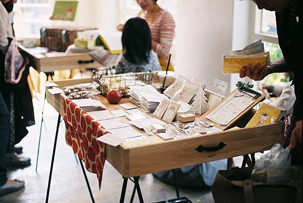 花市集還有另一個特色是會舉辦一日市集,現場販售參展人的作品。當天市集很熱鬧很多人參與,這些參與展覽的女生們很多,甚至說幾乎都是第一次受邀展出,大家都很低調,平常很認真的在做自己喜歡的事情,突然要她們來到活動現場跟大家見面有好幾位表示她們心裡非常緊張。不過就像展覽宗旨一樣,美麗的大家要被看見。自己閱讀34號的部落格很久了,這次她也有被邀請,第一次見到從不在部落格露面的她我心裡好開心,而且在展覽的第一天還有機會一起吃飯,高興得不得了呢!