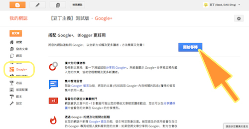 如果你要使用Google+留言功能,就得把你的網誌連到你的Google+。請按Blogspot「設計」平台的Google+,然後按「開始轉移」(如下圖)。