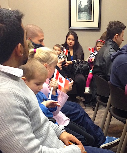 每位親友都獲派加拿大國旗 一小時後,所有宣誓者終於都進場了。