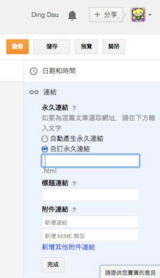 設定文章網址:雖然Blogspot可以自動產生連結,但是大家還是選「自訂永久連結」吧!精簡的名稱會提高搜尋效果。(這是寫新文章必須填寫的項目,因為這些連結都是永久的,一旦發佈後就不能更改。)