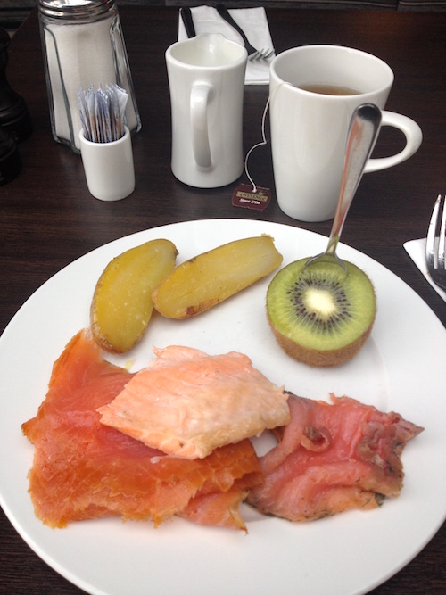 早餐:煙三文魚、芥辣醬、炒蛋和麵包 |