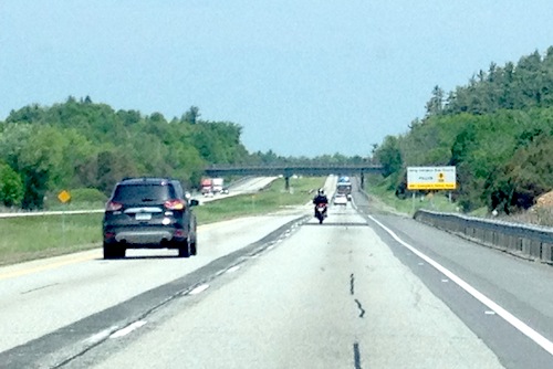 快到魁北克的時候,很多汽車都開得很快。公路限速100km/h,大部分司機都開到130km/h了,有的更是140km/h!我們也是不知不覺間變快了@O@!突然,有電單車從我們旁邊飛過,嘩,是150km/h嗎?