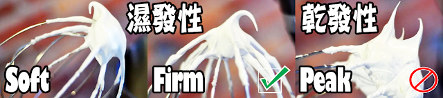 1 打蛋白時: 蛋白霜是否濕發性,要起勾,尖頂要下垂